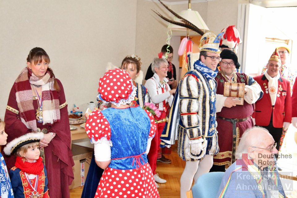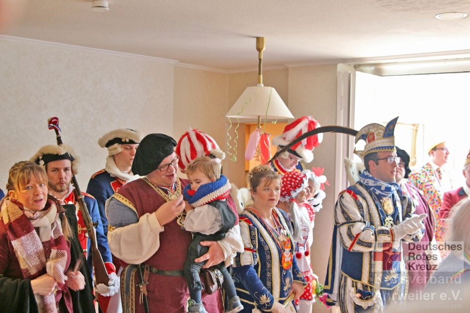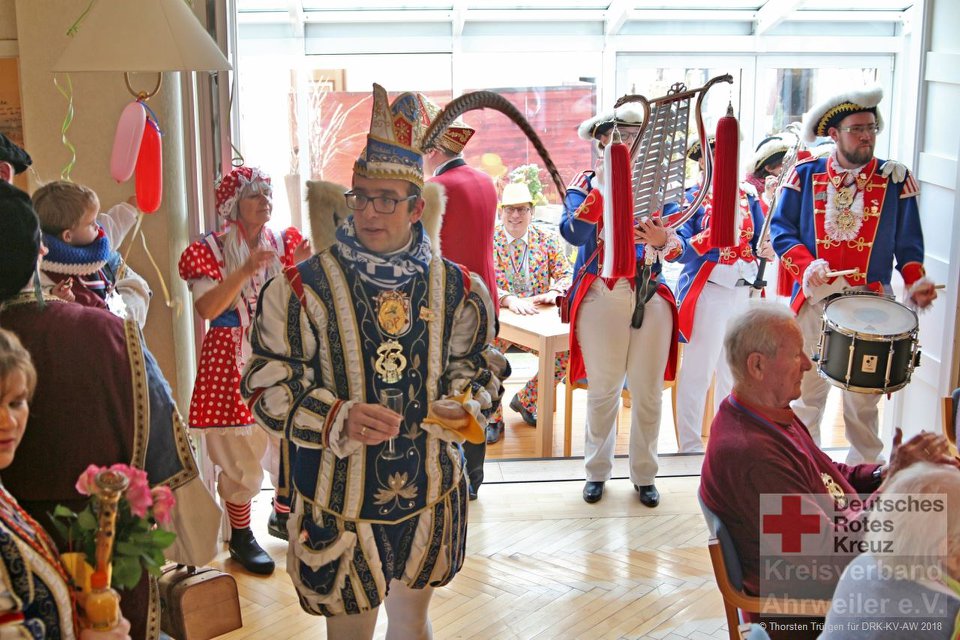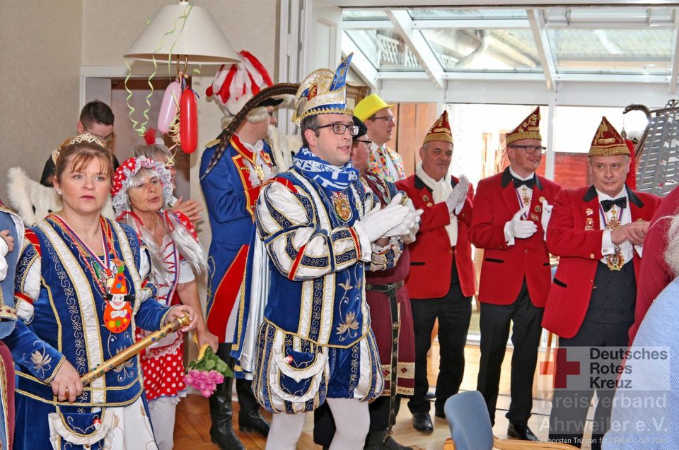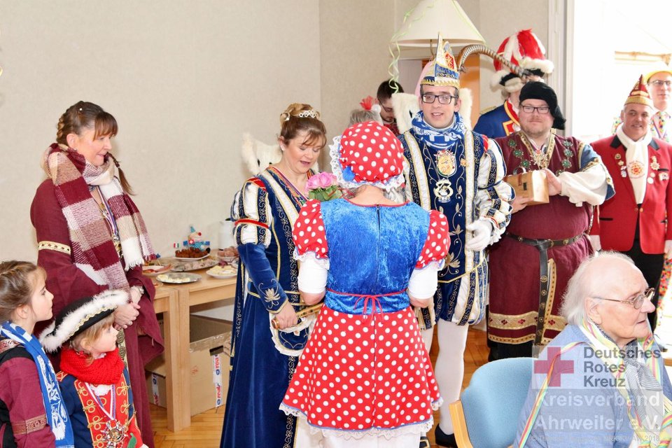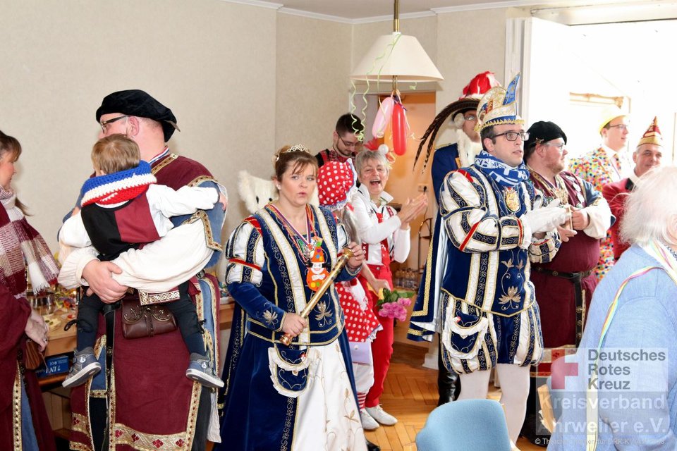 Bad Breisig. Um 9:11 Uhr trafen sich das Team des Betreuungsstützpunktes vom Deutschen Roten Kreuz (DRK) und die Bewohner vom betreuten Wohnen „Weißes Ross“ in Bad Breisig im Mehrzweckraum zum traditionellen Karnevalsbrunch. Gegen 10:45 Uhr zogen Bad Breisigs amtierende Tollitäten Prinz Michael I. und Prinzessin Silke I. (Matern) mit großem Gefolge der Karnevalsgesellschaft in das Weiße Ross ein. Mit ihrem närrischen Aufmarsch lassen die Bad Breisiger Karnevalisten die Bewohner bereits seit vielen Jahren am jecken Treiben in der Brunnenstadt teilhaben.