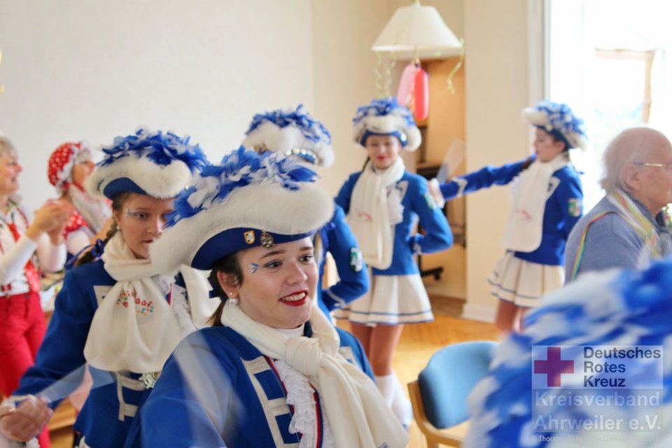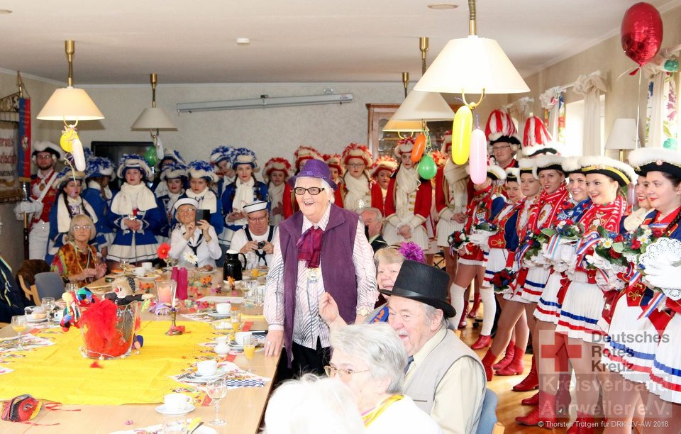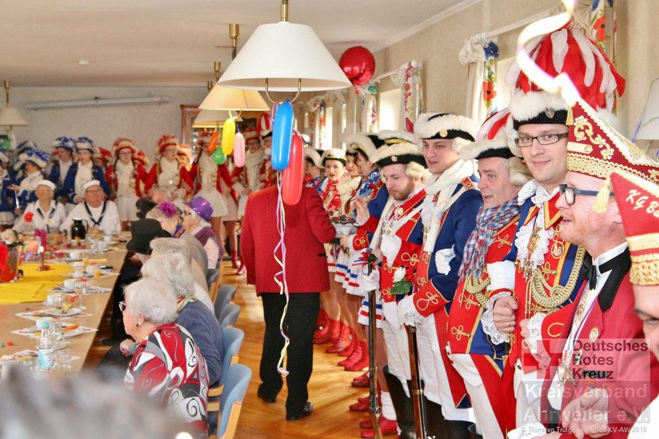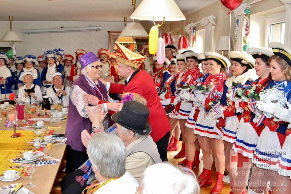 Bestens auf den närrischen Tross eingestimmt empfingen die Senioren die Bad Breisiger Tollitäten und ihr Gefolge. Der musikalisch untermalte Aufmarsch der Karnevalisten brachte die Wände des Gemeinschaftsraums zum Beben und die Stimmung auf den Höhepunkt. Die DRK-Mitarbeiterinnen Petra Schütz und Sabine Gremmler wurden als Dank für ihre Arbeit zum Wohle der Senioren mit dem Sessionsorden der Bad Breisiger Karnevalisten geehrt. Nach dem rund halbstündigen Stelldichein zogen die Narren weiter, um die weiteren Tagestermine wahrzunehmen.